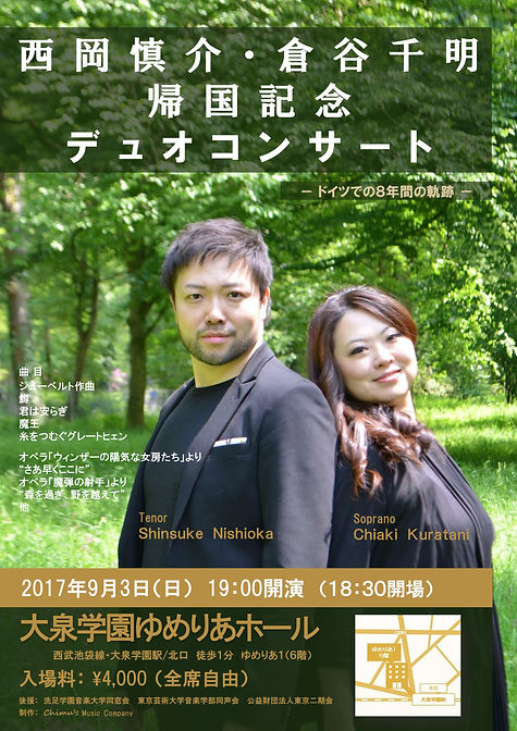 8年間に渡るドイツでの音楽活動を経て、2017年7月末より日本へ拠点を移すこととなりました。これを機にこの度、帰国記念デュオコンサートを開く運びとなりました。プログラムはソプラノ 倉谷 千明、テノール 西岡 慎介による声楽独唱、及び重唱をドイツで学んだ曲を中心に、オペラ、オペレッタ、ドイツ歌曲、日本歌曲の中から8年間の思い出が詰まった曲を集めて演奏予定。